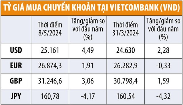 Tại Vietcombank, tỷ giá VND/USD mua chuyển khoản đến cuối ngày 8/5 tăng xấp xỉ 4,49% so với thời điểm đầu năm, vượt qua mức tăng ghi nhận trong cả năm 2023 và cao hơn nhiều mức tăng 2,28% trong quý I/2024.