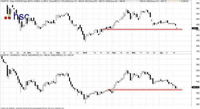 Nền giá đang tiếp cận rất sát với vùng hỗ trợ mạnh quanh 860 điểm. Ðây cũng được xem là mức hỗ trợ mạnh cho chỉ số VN30. Khi mà chỉ số phái sinh đã chiết khấu với vùng hỗ trợ mạnh của chỉ số cơ sở, chúng tôi cho rằng việc bán đuổi theo giá trong giai đoạn này mang nhiều rủi ro.