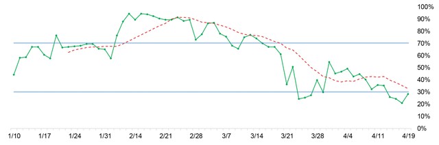 Ðà lan tỏa đang vận động ở vùng quá bán (dưới 30%) cho thấy, nền giá thị trường đang rơi vào trạng thái quá bán. Thông thường, tín hiệu này sẽ phải kích thích dòng tiền quay trở lại thị trường, nhưng điều đó vẫn chưa xuất hiện trong tuần qua.