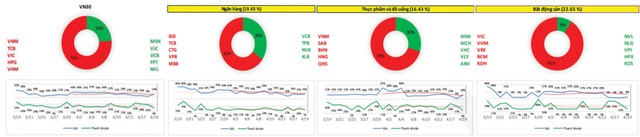 Nhìn chung, rất khó để đặt kỳ vọng vào một nhóm ngành cụ thể nào để tạo hiệu ứng dẫn dắt thị trường ở thời điểm hiện tại, bởi dòng tiền đều lan tỏa kém ở các nhóm ngành. Nhóm ngân hàng thì phân hóa mạnh, chưa tạo hiệu ứng lan tỏa tốt. Nhóm thực phẩm - đồ uống mặc dù nền giá ổn định, nhưng dòng tiền vào rất kém. Trong khi đó, nhóm bất động sản đều ghi nhận quán tính giá và sức hút dòng tiền cũng không tích cực. Kỳ vọng các cổ phiếu lớn sẽ duy trì được mặt bằng giá hiện tại và chỉ số VN30 không thủng các mức hỗ trợ cứng.