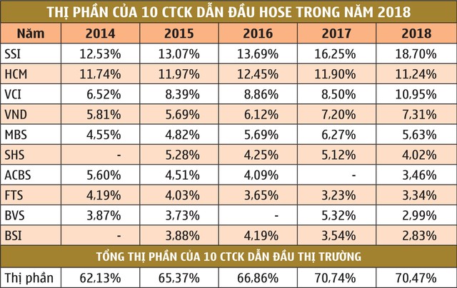 Dù xét về giá trị, tổng thị phần của 10 CTCK dẫn đầu trên HOSE năm 2018 vẫn tương đương với năm 2017 với hơn 70,47% và thứ tự Top 5 cũng hầu như không thay đổi, lần lượt là SSI, HCM, VCI, VND và MBS, nhưng sự phân hóa diễn ra rõ nét.