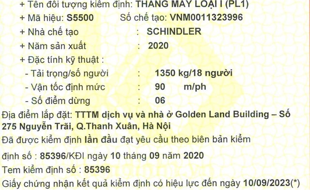 Theo tìm hiểu của phóng viên, thang máy được thi công theo cấp phép cải tạo xây dựng số 80/GPCT do Sở xây dựng UBND thành phố Hà Nội và có giấy chứng nhận kết quả kiểm định mới nhất số 85396 hiệu lực từ 10/9/2020 đến 10/9/2023.