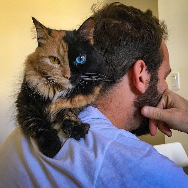 Theo đó, chú mèo này được phối màu một cách độc nhất vô nhị, cảm giác như có hai khuôn mặt (một đen một vàng) cùng với đôi mắt cũng đặc biệt vô cùng với mắt trái màu vàng như hổ phách, mắt phải màu xanh dương như loại đá Topaz Blue sáng và đẹp. Sự phân chia màu sắc còn được kéo dài từ ngực cho đến chân trước của con mèo với các bên màu được đảo ngược.
