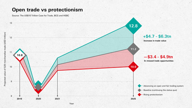Báo cáo với tiêu đề “10 nghìn tỷ USD cho Thương mại mở” được các chuyên gia tại Boston Consulting Group (BCG) và HSBC thực hiện. Đúc kết từ tài liệu chuẩn bị cho Diễn đàn kinh doanh G20 (Business 20 - B20), diễn đàn nơi các nhà lãnh đạo doanh nghiệp toàn cầu đưa ra các khuyến nghị chính sách cho nhóm G20, báo cáo định lượng những lợi ích và chi phí tương đối của thương mại mở so với chủ nghĩa bảo hộ.