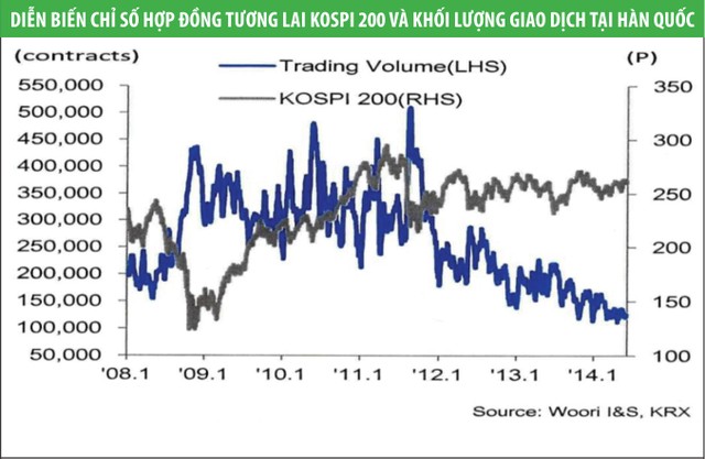 Điều đó giải thích tại sao thanh khoản của thị trường phái sinh thông thường sẽ tăng rất mạnh trong các giai đoạn thị trường cơ sở rung lắc, biến động mạnh. Đây cũng chính là hiệu ứng thị trường, giúp trấn an và ổn định tâm lý của nhà đầu tư. Thị trường phái sinh là giải pháp hữu hiệu để giữ chân nhà đầu tư, tránh tình trạng họ tháo chạy khỏi TTCK khi thị trường cơ sở sụt giảm. Dữ liệu thực tế tại các thị trường quốc tế (xem biểu đồ tại thị trường Hàn Quốc) cho thấy, khi thị trường cở sở giảm điểm mạnh thì thanh khoản trên thị trường phái sinh tăng mạnh; ngược lại, khi thị trường cơ sở tăng điểm trở lại thì thanh khoản trên thị trường phái sinh giảm.