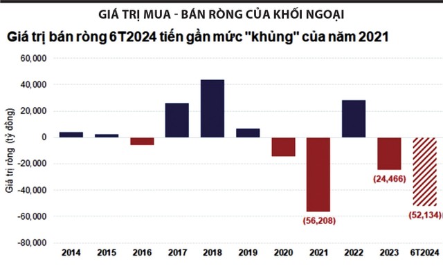 Tháng 6 vừa qua, sàn HOSE ghi nhận giá trị bán ròng của khối nhà đầu tư nước ngoài là gần 17.000 tỷ đồng. Lũy kế 6 tháng đầu năm 2024, giá trị bán ròng của khối ngoại xấp xỉ 52.134 tỷ đồng, gấp đôi mức bán ròng của cả năm 2022.