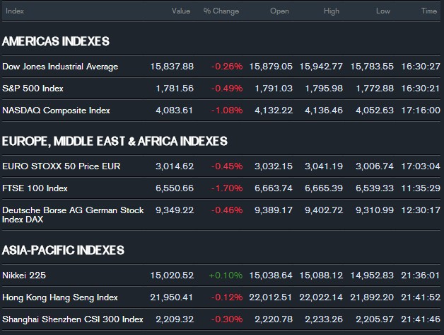 Chỉ số Standard & Poor’s 500 giảm 0,5% xuống còn 1.781,56 điểm vào lúc 4h chiều New York sau khi đã giảm tổng cộng 2,6% trong tuần trước. Chỉ số công nghiệp Dow Jones giảm 41,23 điểm, tương đương 0,3%, xuống còn 15.837,88 điểm. Cả hai chỉ số này đều đóng cửa ở mức thấp nhất kể từ giữa tháng 12/2013. Khoảng 8 tỷ cổ phiếu đã được sang tay trên TTCK Mỹ, tăng 30% so với mức trung bình 3 tháng.