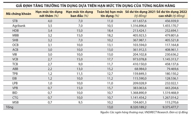 Trong đợt cấp tín dụng tháng 9, 18 ngân hàng được cấp thêm chiếm khoảng 80% tín dụng hệ thống. Nhóm chuyên gia phân tích tại Công ty Chứng khoán VNDIRECT ước tính, với hạn mức tín dụng mới, tổng tăng trưởng tín dụng sẽ đạt khoảng 13% vào cuối năm 2022, tiệm cận mức định hướng 14% của cơ quan quản lý. Vì vậy, với mục tiêu hàng đầu là kiểm soát lạm phát và ổn định vĩ mô hiện nay, cơ hội để có thêm một đợt tăng hạn mức tín dụng không nhiều.