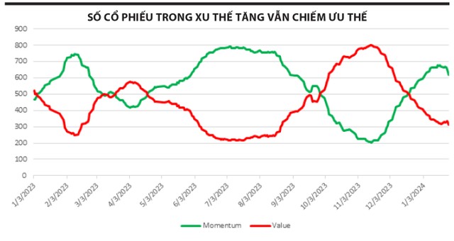 Hiện tại, chúng tôi vẫn ưu tiên chiến lược giao dịch theo Đà tăng (Momentum) khi dữ liệu cho thấy chúng ta đang có nhiều lựa chọn hơn ở các cổ phiếu có xu thế tăng – thống kê trên mẫu gồm hơn 1.000 cổ phiếu có giao dịch trên toàn thị trường thì có tới 616 cổ phiếu đang trong xu thế tăng và chỉ có 313 cổ phiếu trong xu thế giảm.