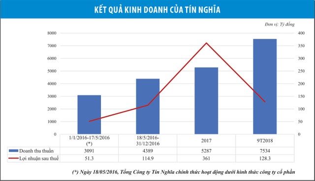 Tuy doanh thu thuần mỗi năm của Tín Nghĩa rất lớn, lên tới 7.480 tỷ đồng trong năm 2016, 5.787 tỷ đồng trong năm 2017 và 7.537 tỷ đồng trong 9 tháng đầu năm nay, song biên lợi nhuận ròng của Tín Nghĩa lại rất thấp, chỉ dưới 5%. Công ty chịu các khoản chi phí lớn, dẫn đến lợi nhuận thu về chưa tương xứng với doanh thu đạt được.