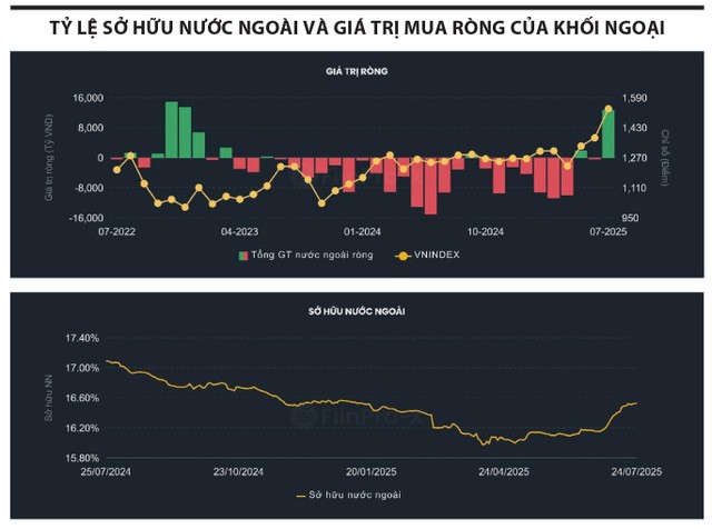 Sau nhiều tháng liên tục bán ròng, khối ngoại đã bất ngờ quay trở lại mua ròng mạnh mẽ trong tháng 7/2025 với tổng giá trị gần 16.000 tỷ đồng - mức cao nhất kể từ giữa năm 2022. Diễn biến này được thể hiện rõ qua đồ thị giá trị ròng (từ bán ròng chuyển sang mua ròng mạnh), song song với đà phục hồi ấn tượng của chỉ số VN-Index lên vùng 1.500 điểm.