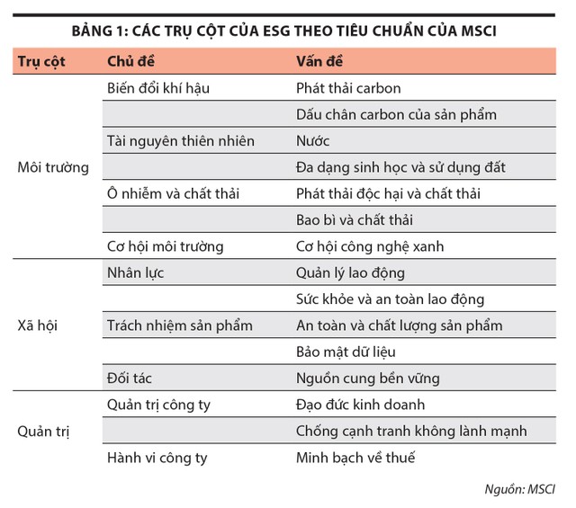 Bảng 1 thể hiện các trụ cột của ESG theo tiêu chuẩn MSCI được cụ thể hóa với các chủ đề chi tiết, kèm theo đó là những diễn giải vấn đề. Bản mô tả chi tiết các trụ cột giúp các doanh nghiệp theo đuổi việc tuân thủ sẽ dễ dàng hơn trong việc xác định các vấn đề trọng tâm mà doanh nghiệp cần rà soát, hạn chế việc theo đuổi tiêu chuẩn ESG một cách mơ hồ.