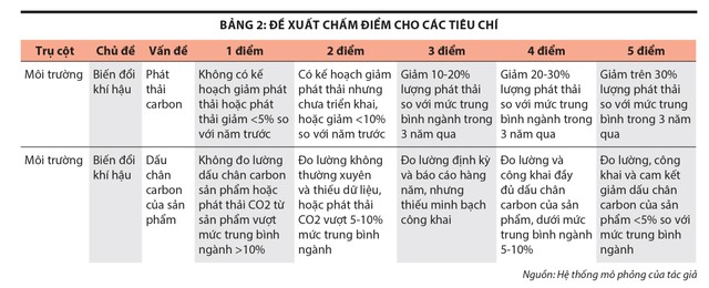Tiếp theo đó, các chủ đề được phát triển ở bảng 1 sẽ được xếp hạng theo thang điểm từ 1 - 5 dựa trên các mức độ đạt được của doanh nghiệp. Bảng 2 trình bày ví dụ về cách lượng hóa thang điểm đối với chủ đề biến đối khí hậu, liên quan đến vấn đề phát thải carbon và vấn đề dấu chân carbon của sản phẩm. Điểm quan trọng trong việc xây dựng bảng chấm điểm đó là các thang điểm cần phải có tính lượng hóa cụ thể, dựa trên các mức độ đạt được của doanh nghiệp. Tổng hợp điểm của tất cả các vấn đề sẽ xác định được mức xếp hạng của doanh nghiệp liên quan đến mức độ tuân thủ ESG.