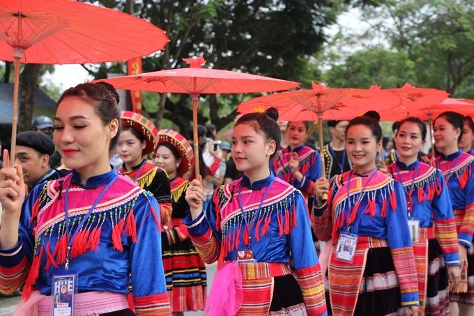 Những cô gái đến từ đoàn nghệ thuật ca múa nhạc Việt Bắc gây ấn tượng với người dân Huế và du khách qua chiếc dù và trang phục truyền thống.