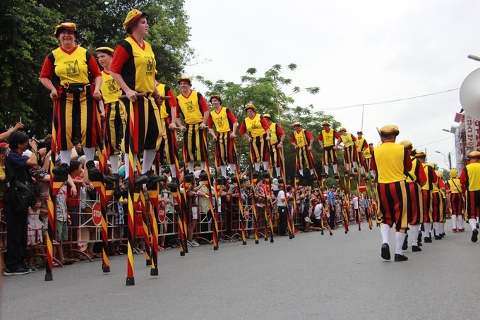 Đoàn cà kheo “De Steltenlopers van Merchtem” của Vương quốc Bỉ trình diễn trên đường Trần Hưng Đạo.