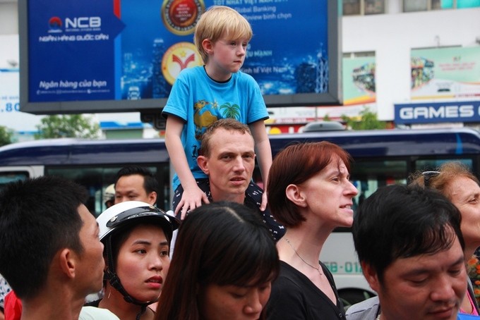 Một du khách Tây cõng theo con trai chen chúc trong đám đông.