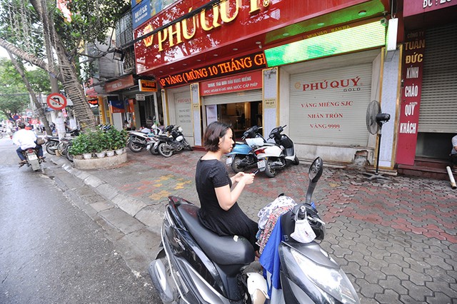 7h sáng, đã có khách hàng đứng chờ một cửa hàng vàng trên phố Trần Nhân Tông mở cửa