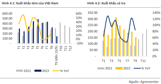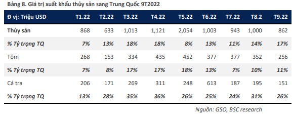 Đối với ngành cá tra, BSC cho rằng, tăng trưởng của ngành sẽ phụ thuộc vào việc mở cửa của Trung Quốc sau thời gian dài theo đuổi chiến dịch Zero Covid. BSC kỳ vọng việc Trung Quốc mở cửa sẽ kéo theo nhu cầu tiêu thụ cá tra tăng cao sau thời gian dài bị kìm nén, giúp cả ngành cá tra tăng trưởng. Đối với thị trường Mỹ, BSC kỳ vọng kim ngạch xuất khẩu sẽ khả quan trở lại khi hàng tồn kho tại cảng được tiêu thụ hết.
