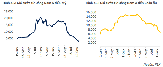 Đồng thời, giá cước vận tải tiếp tục giảm mạnh, tiệm cận dần với giá cước trước dịch Covid. Giá cước từ Đông Nam Á đến Mỹ trung bình tháng 9 quanh 3.417 USD (giảm 81% từ đỉnh và giảm 83% so với cùng kỳ năm ngoái). Giá cước từ Đông Nam Á đến châu Âu quanh mức 7.241 USD (giảm 51% từ đỉnh và 49% so với cùng kỳ năm ngoái).