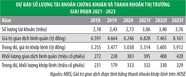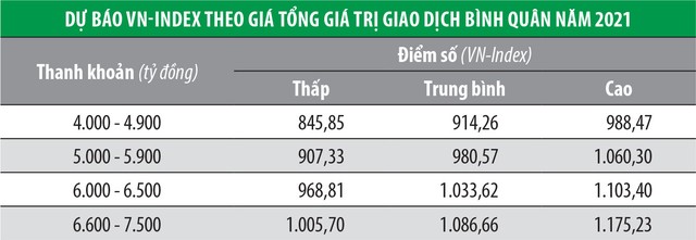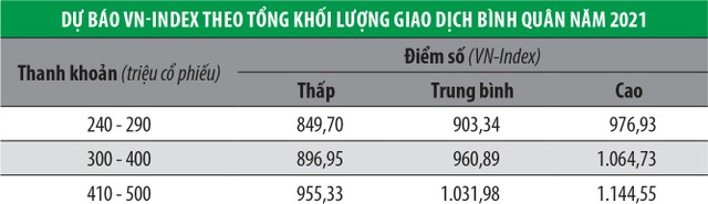 Cho năm 2021, trong kịch bản tích cực, thanh khoản thị trường có thể đạt trên 400 triệu cổ phiếu/phiên, giá trị giao dịch 6.600 - 7.500 tỷ đồng/phiên, VN-Index tăng lên 1.145 - 1.175 điểm.