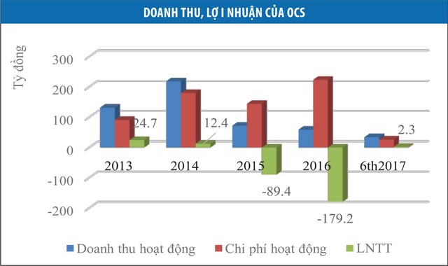Cụ thể, các báo cáo kết quả kinh doanh của OCS cho thấy, sau “sự biến” năm 2014, doanh thu hoạt động của Công ty giảm mạnh từ 218 tỷ đồng trong năm 2014 xuống 71,8 tỷ đồng năm 2015 và 58,8 tỷ đồng năm 2016. Trong khi đó, chi phí hoạt động tăng cao, chủ yếu do trích lập dự phòng các khoản phải thu khó đòi về giao dịch ký quỹ, khiến lợi nhuận trước thuế năm 2015 âm 89,4 tỷ đồng, năm 2016 âm 179,2 tỷ đồng.