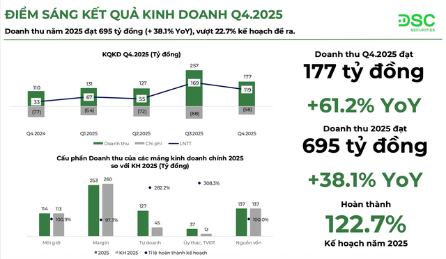 Lũy kế năm 2025, doanh thu của DSC đạt 695 tỷ đồng, tăng 38,1% so với năm 2024 và hoàn thành 122,7% kế hoạch năm; lợi nhuận trước thuế đạt 344 tỷ đồng, tăng trưởng ấn tượng 55,9% và hoàn thành 132% kế hoạch. Đây là mức tăng trưởng nổi bật trong bối cảnh thị trường chứng khoán còn nhiều biến động, cho thấy năng lực thích ứng và điều hành hiệu quả của DSC.