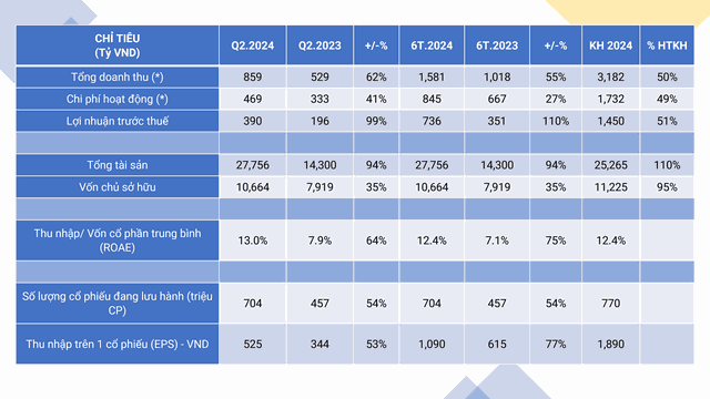 Theo đó, lợi nhuận trước thuế quý 2/2024 của Công ty đạt 390 tỷ đồng, tăng 99% so với cùng kỳ năm 2023 và là mức cao nhất trong 11 quý liền kề gần đây. Lũy kế 6 tháng đầu năm, HSC ghi nhận lợi nhuận trước thuế đạt 736 tỷ đồng, tăng 110% so với cùng kỳ năm 2023, hoàn thành 51% kế hoạch năm 2024.