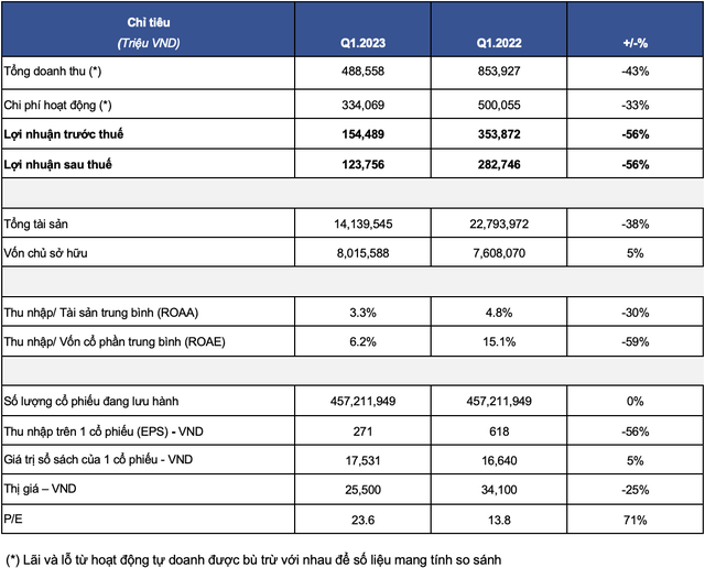 Thu nhập trên một cổ phiếu (EPS) quý I/2023 đạt 271 đồng/cổ phiếu. Hệ số thu nhập trên vốn cổ phần (ROAE) 6,2%.