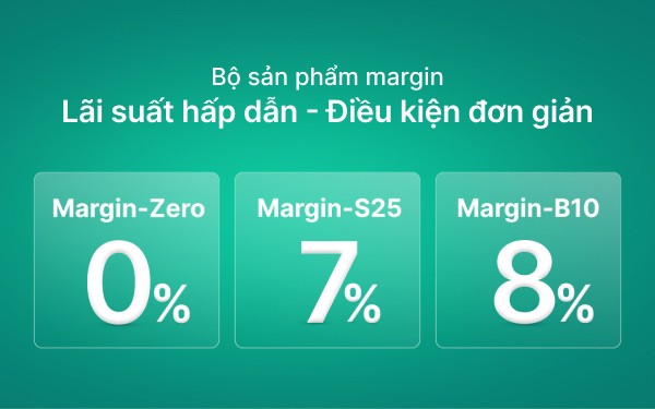 Margin-S25: Sản phẩm này áp dụng lãi suất 7% cho khách hàng có tỷ lệ danh mục đầu tư S25 trên 75%. Margin-S25 giúp các nhà đầu tư chuyên nghiệp tối ưu hóa lợi nhuận từ các danh mục đầu tư được đánh giá cao.