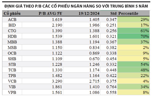 Năm 2025, nhóm cổ phiếu ngân hàng được dự báo sẽ trở thành động lực chính của thị trường chứng khoán. Định giá của nhóm này đang ở mức hấp dẫn với P/B dao động từ 1 - 1,3 lần, thấp hơn đáng kể so với mức trung bình các thị trường trong khu vực.