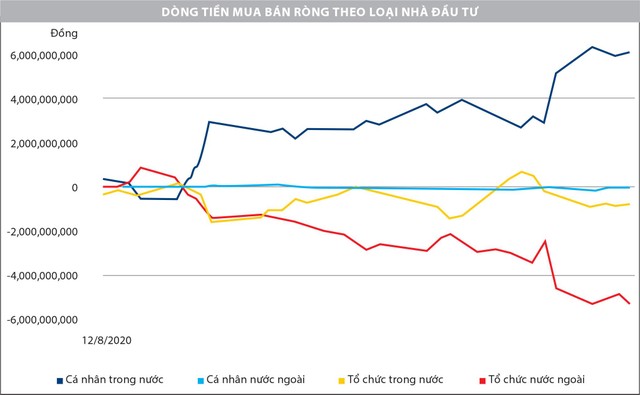 Kể từ đầu tháng 12/2020 tới nay, dòng tiền nhà đầu tư cá nhân mua vào rất mạnh, dù không ít nhà đầu tư tổ chức nước ngoài và tổ chức đầu tư trong nước bán ròng.
