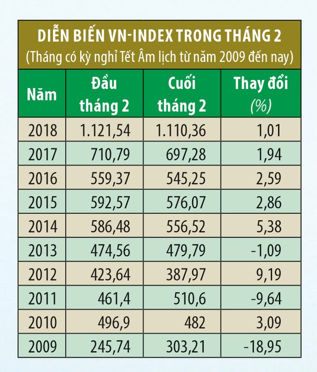 Trong tháng 1/2019, phân tích của Công ty Chứng khoán FPT (FPTS) về hiệu ứng kỳ nghỉ Tết Âm lịch cho thấy, VN-Index đã tăng 11/18 lần, HNX Index tăng 9/13 lần trong 5 ngày giao dịch sau Tết. Rộng hơn, theo thống kê diễn biến của chỉ số VN-Index trong tháng 2 hàng năm - tháng trùng với kỳ nghỉ Tết Âm lịch từ năm 2009 đến nay, xu hướng tăng điểm cũng chiếm ưu thế gần như tuyệt đối với 7/9 năm.