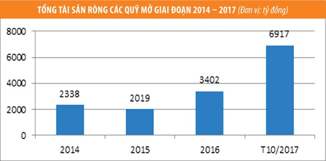 Xét về huy động vốn, năm 2017 ghi nhận sự tăng trưởng đột phá của thị trường quỹ mở Việt Nam. Chỉ riêng trong 10 tháng đầu năm, tổng giá tài sản ròng của các quỹ mở đạt 6.917 tỷ đồng, tăng 103,32% so với cùng kỳ năm 2016. Đây là mức tăng trưởng đột biến trong 4 năm trở lại đây. Các kênh huy động vốn cũng khá đa dạng, từ các công ty quản lý quỹ, công ty chứng khoán, ngân hàng.