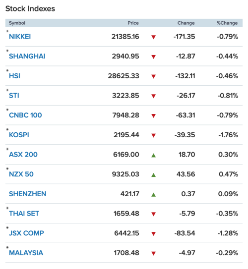 Chỉ số Nikkei 225 của thị trường Nhật Bản giảm gần 0,8%, Shanghai của thị trường Trung Quốc giảm 0,4%.