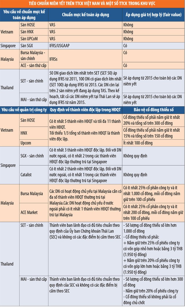 Câu hỏi đặt ra cho Việt Nam là: Liệu 5 năm tới, Việt Nam có nâng tiêu chuẩn, yêu cầu niêm yết tương đương Thái Lan, Malaysia bây giờ không? 10 năm nữa có nâng lên bằng Singapore hiện tại không? Khi đó, tiêu chuẩn, yêu cầu của họ có thể sẽ tăng lên, nhưng Việt Nam cần hoạch định các bước đi cụ thể để đạt được các mục tiêu này.