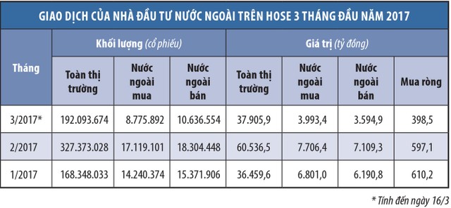 Lo ngại lớn nhất của giới đầu tư chính là nguy cơ dòng vốn ngoại bị rút ra khỏi thị trường. Trong năm 2016, riêng sàn HOSE, khối ngoại bán ròng 7.974 tỷ đồng và thống kê cho thấy, dòng tiền các quỹ rút ra lên đến hơn 400 triệu USD. Không chỉ tại Việt Nam, việc Fed tăng lãi suất trong năm ngoái cũng khiến hàng loạt thị trường mới nổi bị rút lượng tiền kỷ lục. Tuy nhiên, trong 3 tháng đầu năm nay, khối ngoại đã quay lại mua ròng trên HOSE, giá trị hơn 1.600 tỷ đồng.