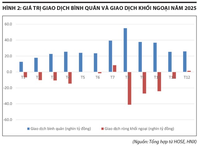 Áp lực bán ròng của khối nhà đầu tư nước ngoài cũng giảm mạnh vào giai đoạn cuối năm, với giá trị bán ròng trong tháng 11/2025 chỉ còn hơn 8.300 tỷ đồng. Sang tháng 12, khối ngoại đã quay lại trạng thái mua ròng với giá trị hơn 1.400 tỷ đồng. Điều này cho thấy niềm tin của nhà đầu tư quốc tế đang dần được củng cố sau những chuyển biến tích cực từ thị trường và niềm tin vào các chính sách mà Việt Nam đã, đang và sẽ triển khai.