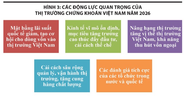 Trước hết, môi trường vĩ mô toàn cầu và trong nước được kỳ vọng tiếp tục theo hướng hỗ trợ tăng trưởng. Việc các ngân hàng trung ương lớn, đặc biệt là Cục Dự trữ Liên bang Mỹ (Fed) và Ngân hàng Trung ương châu Âu (ECB), bước vào chu kỳ giảm lãi suất tạo ra dư địa quan trọng cho dòng vốn đầu tư quay trở lại các thị trường mới nổi. Mặt bằng lãi suất toàn cầu hạ nhiệt không chỉ giúp giảm chi phí vốn, cải thiện triển vọng lợi nhuận doanh nghiệp, mà còn thúc đẩy dòng tiền dịch chuyển sang các tài sản rủi ro hơn, trong đó có cổ phiếu tại các thị trường có tiềm năng tăng trưởng cao như Việt Nam. Trong nước, chính sách điều hành tài khóa, tiền tệ tiếp tục theo hướng linh hoạt, ổn định vĩ mô, tạo nền tảng cho hoạt động sản xuất, kinh doanh và đầu tư phát triển. (Hình 3)