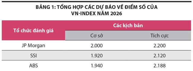 Ở góc độ quốc tế, các tổ chức như World Bank và IMF đều đánh giá Việt Nam tiếp tục là điểm sáng tăng trưởng trong nhóm thị trường mới nổi, nhờ nền tảng vĩ mô ổn định và vai trò ngày càng rõ trong chuỗi cung ứng toàn cầu. Trong khi đó, FTSE Russell và MSCI ghi nhận những cải thiện tích cực về minh bạch, hạ tầng và khả năng tiếp cận thị trường, qua đó củng cố kỳ vọng nâng hạng và thu hút dòng vốn dài hạn trong những năm tới. Theo Ngân hàng JP Morgan, ở kịch bản tích cực, VN-Index kết thúc năm 2026 ở mức 2.200 điểm. (Bảng 1)