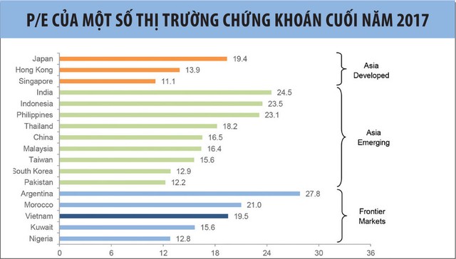 (ĐTCK) Trong báo cáo cập nhật về thị trường chứng khoán Việt Nam, Indochina Capital cho rằng, mặc dù P/E của thị trường đã chạm mức cao kỷ lục 10 năm, đạt 19,3 lần vào cuối năm 2017, nhưng vẫn thấp hơn P/E của thị trường Indonesia và Phillippines. Loại 15 mã có vốn hóa lớn nhất thị trường thì bình quân P/E trên sàn HOSE ở mức 14,4 lần.