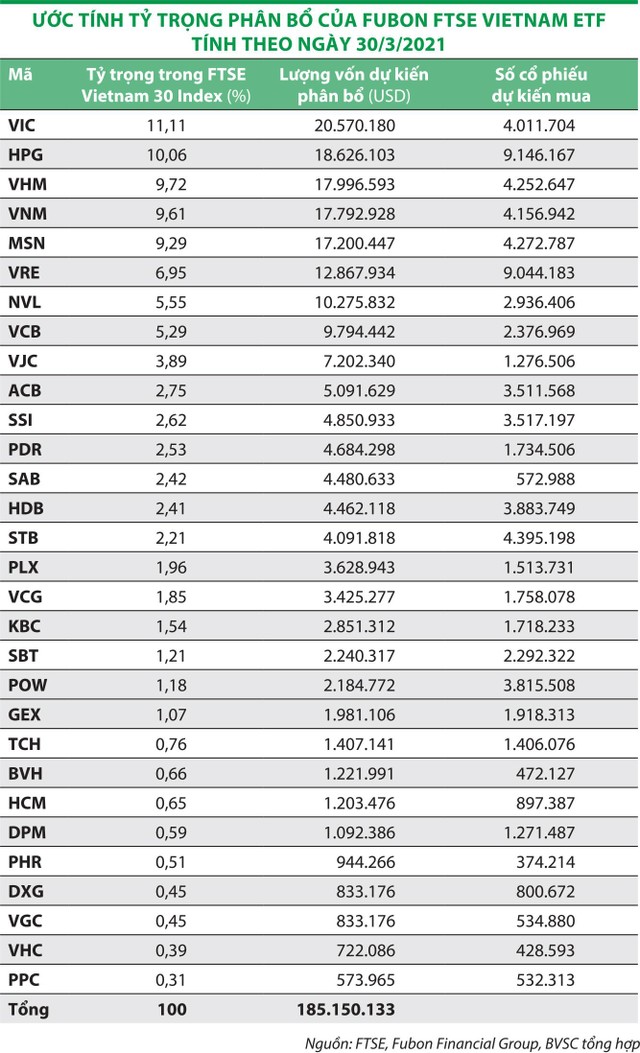 Theo Công ty Chứng khoán Bảo Việt, cổ phiếu vốn hoá lớn sẽ được Quỹ Fubon mua vào nhiều nhất, ước tính gần 20,6 triệu USD dành cho cổ phiếu VIC; tại HPG, VHM, VNM, MSN là trên dưới 18 triệu USD mỗi cổ phiếu; tiếp theo là VRE với gần 12,9 triệu USD, VNL gần 10,3 triệu USD, VCB gần 9,8 triệu USD…