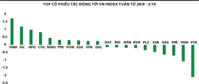 Trong tuần, các cổ phiếu trụ tăng giảm đan xen nhau, trong đó các cổ phiếu tác động tích cực lên thị trường là VNM, VIC, HPG, CTG, MWG… Chiều ngược lại, VCB, VHM, VRE, GAS… tác động tiêu cực tới chỉ số.