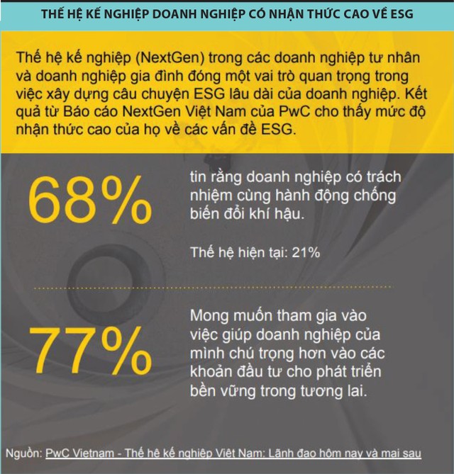 Ngoài ra, thực hành ESG có thể mang đến những cơ hội thực tế để doanh nghiệp kết nối sâu sắc hơn với người tiêu dùng. Khảo sát của PwC năm 2024 cho thấy, 54% người tiêu dùng Việt Nam sẵn sàng trả thêm cho sản phẩm bền vững, tạo cơ hội cho các doanh nghiệp gia đình tận dụng lợi thế từ ESG. Hiện nay, các doanh nghiệp Việt Nam đã chủ động nắm bắt, chuyển đổi mô hình kinh doanh, ra mắt thị trường các sản phẩm mới thân thiện với môi trường, hoặc giới thiệu các sản phẩm, dịch vụ đón đầu xu hướng xanh.