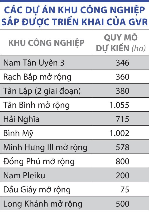 Ngoài ra, GVR còn đầu tư vào 7 công ty con quản lý các khu công nghiệp với tổng diện tích hơn 6.000 ha đất công nghiệp, hàng năm mang về doanh thu khoảng 1.000 tỷ đồng.