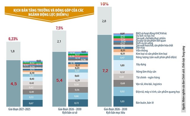 Nguyên do, 17 ngành này đang góp 4,5 điểm phần trăm vào tăng trưởng chung của nền kinh tế trong giai đoạn 2021-2025, cao hơn toàn bộ các ngành còn lại (khoảng 1,79 điểm phần trăm). Nếu thúc đẩy thêm 3,8 điểm phần trăm, tốc độ tăng trưởng của các ngành này sẽ đạt 10,5%, đóng góp rất đáng kể cho mục tiêu tăng trưởng 10% ngay trong các năm tới.