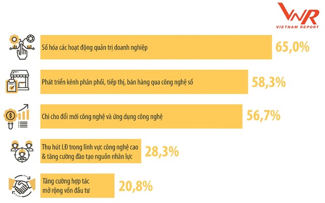 Khảo sát mới nhất của Vietnam Report cho thấy, Top 3 chiến lược của doanh nghiệp để chuẩn bị đưa chuyển đổi số vào hoạt động kinh doanh, đó là số hóa các hoạt động quản trị doanh nghiệp (chiếm tỷ lệ 65,0%); phát triển kênh phân phối, tiếp thị, bán hàng qua công nghệ số (58,3%) và chi cho đổi mới công nghệ và ứng dụng công nghệ (56,7%).