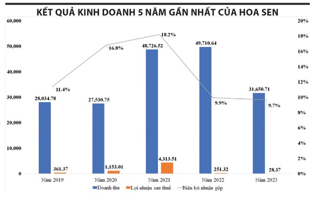 Trong niên độ tài chính 2022-2023 (từ 1/10/2022-30/9/2023), Hoa Sen ghi nhận doanh thu đạt 31.650,7 tỷ đồng, giảm 36,3% và lợi nhuận sau thuế ghi nhận 28,37 tỷ đồng, giảm 88,7% so với niên độ trước. Trong đó, biên lợi nhuận gộp giảm từ 9,9% xuống 9,7%.