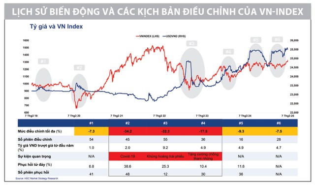 Nhìn lại dữ liệu từ năm 2019, các nhịp điều chỉnh lớn của VN-Index do biến động tỷ giá thường không quá mạnh, nếu không có sự kiện “thiên nga đen” nào xảy ra. Trong những trường hợp thị trường chịu áp lực thuần túy từ tỷ giá, VN-Index chủ yếu điều chỉnh 7 - 9% so với đỉnh gần nhất.