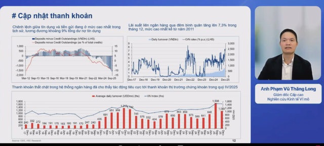 Trong hội thảo trực tuyến C2C chủ đề "Động lực 2026: Việt Nam tự cường" do Công ty Chứng khoán HSC tổ chức, phân tích dữ liệu, ông Phạm Vũ Thăng Long, Giám đốc Nghiên cứu Cấp cao HSC cho biết, thanh khoản thị trường chứng khoán Việt Nam vượt lên đứng thứ 3 trong khu vực. Tốc độ tăng 35% của VN-Index đồng hành với tăng trưởng kinh tế, chưa có dấu hiệu tăng nóng. Dù vậy, có sự bất cân xứng trong hiệu quả thị trường, khi mức tăng 20% đến từ sự đóng góp từ nhóm các cổ phiếu Vingroup. Điều này là cũng thể hiện động lực mới từ tăng trưởng kinh tế Việt Nam đến từ khu vực tư nhân.