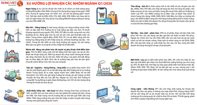 Trong ngắn hạn, triển vọng kết quả kinh doanh quý I/2026 của các doanh nghiệp vẫn duy trì sự tích cực. Theo đó, danh mục phân tích của Rồng Việt cho thấy mức tăng trưởng lợi nhuận của quý có thể đạt 38% so với cùng kỳ. Mức tăng trưởng này được dẫn dắt bởi cầu nội địa và chu kỳ đầu tư, thể hiện rõ ở nhóm ngân hàng, bán lẻ. Bên cạnh đó, các ngành hưởng lợi từ giá hàng hóa/ biến động địa chính trị có xác suất tạo bất ngờ lớn so với mặt bằng chung.